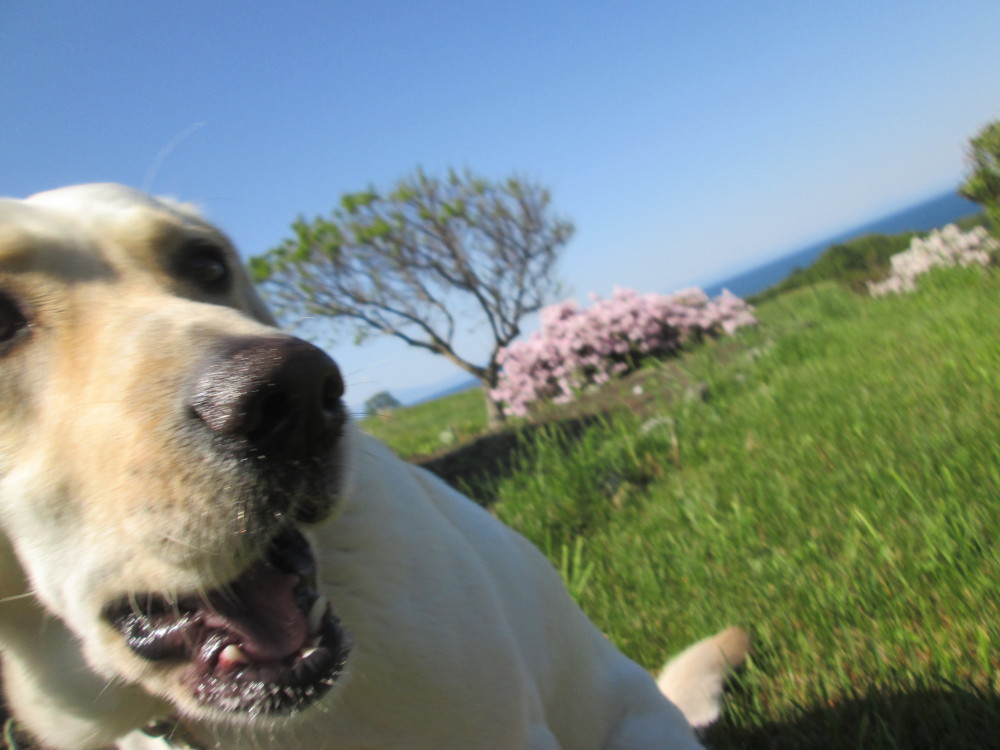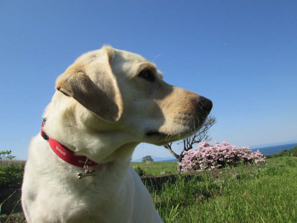 ツツジをバックに。