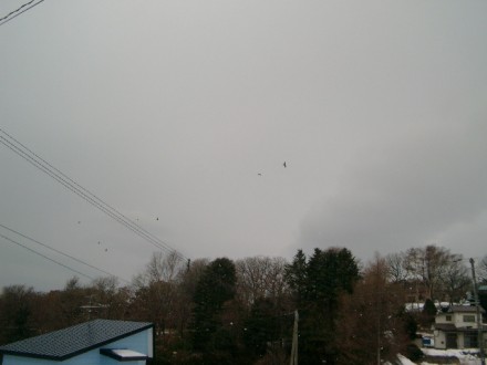 朝からトビとカラスがばたばたにぎやかに騒いでいます。トビは数羽、対してカラスは数十羽。カラスはグループでトビを囲み、カーカー、ばたばた、そして時おりバンという音も聞こえます。穏やかな感じではありませんね。写真では小さくてわかりずらいですね。
