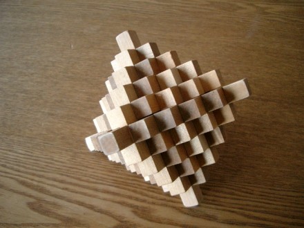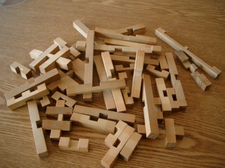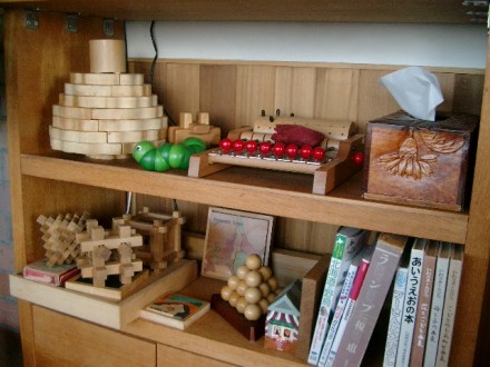 木製の組み木です。知っている方や上手にできる方がたくさんいると思います。はじめての方にはやりがいのある組み木ですので、ゆっくり遊んでみてほしいです。お友だちといっしょにやってみるのも楽しいですよ。おもちゃの棚には似たような組み木やおもちゃがまだありますので、また紹介しますね。