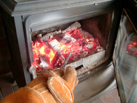 薪をくべる時にも同じようなことが起こります。熾きになってしまった薪はすごく軽くてもろいです。くべられた薪の勢いで砕けて、たまにこぼれてきます。薪の樹種によっては「爆ぜて」飛び出すことがあります。楢の薪はほとんど爆ぜませんが、熾きの扱いに注意が必要です。