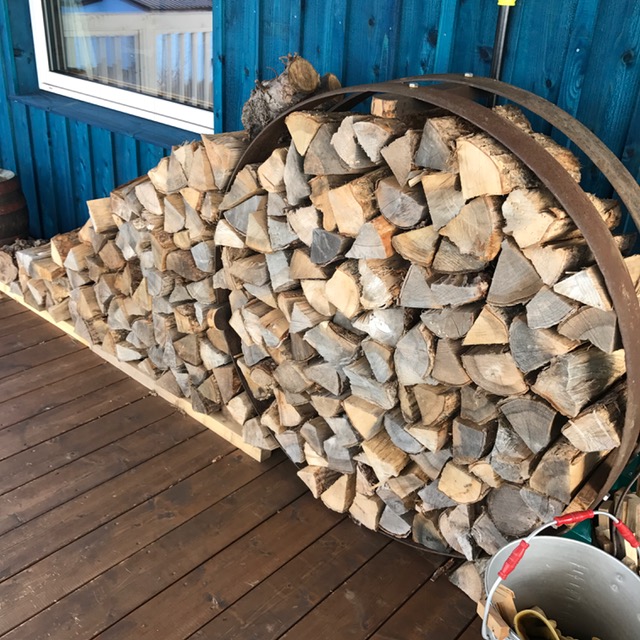 この薪を焚き終わると、テラスには車輪の薪棚に積むだけです。