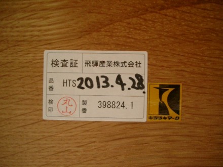 テーブルは現在のキツツキのシール(飛騨産業のロゴマーク)がついていますが、古い椅子には昔のキツツキのシールがついています。