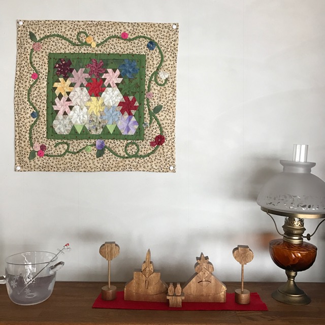 新緑の緑の入ったキルトをバックにお雛さん。