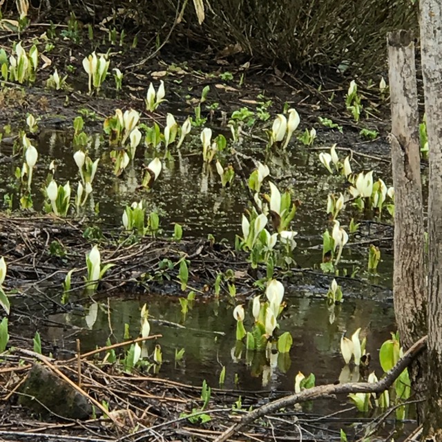 雪解けがおわったばかりのこの湿地では、ちょうどミズバショウが顔をだしたところでした。