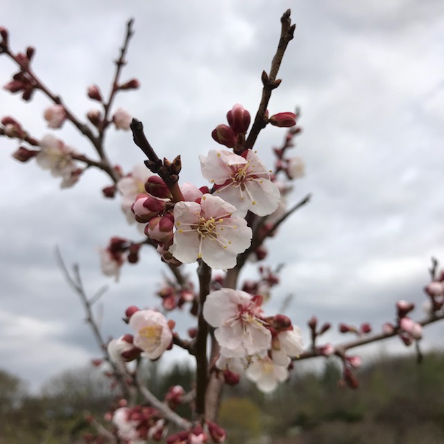 きのうの雨が止み、梅の花のつぼみが開きだしました。