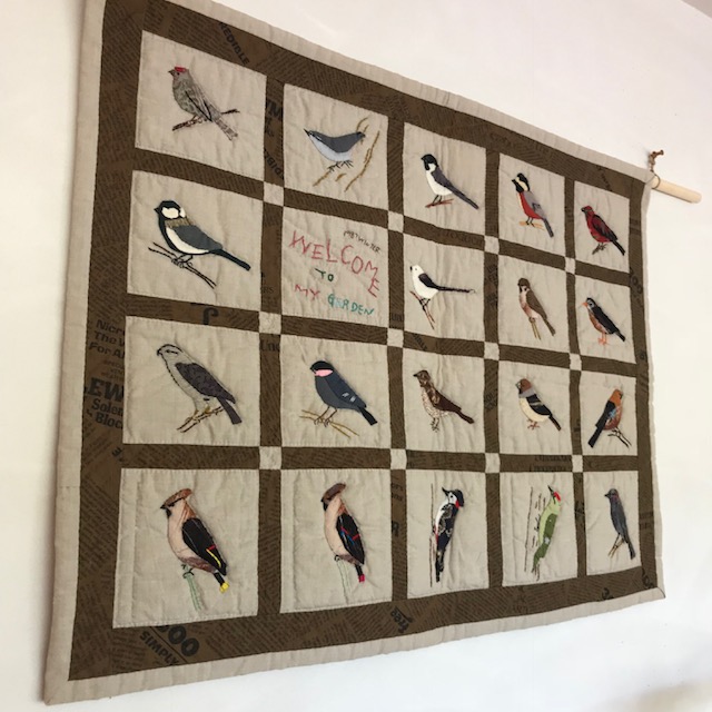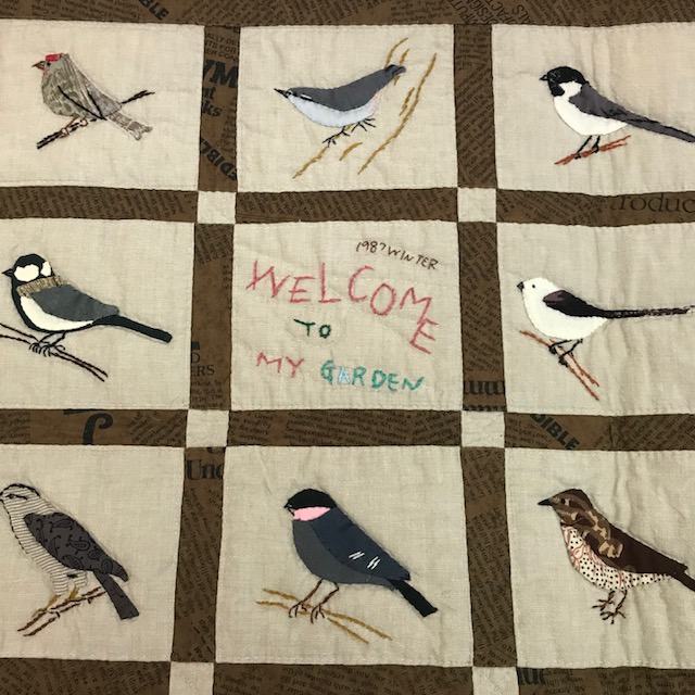 小林さんのお庭にやってきた野鳥たちが描かれたキルトです。