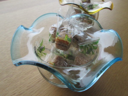 この器も古いもので、「丸灰皿」という名前のオールド北一硝子。まだ喫煙が主流の時代、どこの家庭でも灰皿が使われていました。そんな当時、灰皿としてではなく、形がかわいいので小物入れとして買ったものです。今ではお店のシュガーポットとして活躍しています。