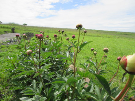 雲の間から青空が見え、やっと雨が上がりました。花畑の花も少しずつ咲き始めました。シャクヤクは大きなつぼみを膨らませています。
