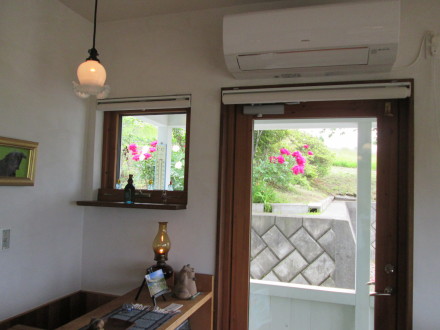 シャクヤクの花が咲いています。入口のドアを通してきれいに見えます。コーヒーの味が変わるようです。