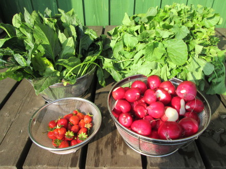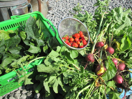 畑の作物はどんどん大きくなっています。昨日はホウレンソウ、いちご、ラディッシュを収穫しました。