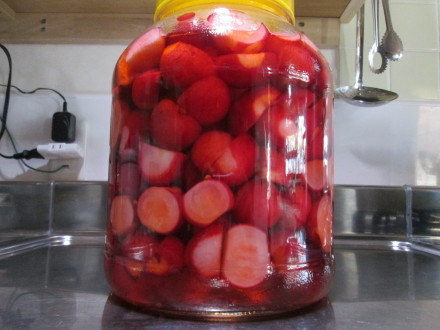 ラディッシュはいつものピクルスです。ピクルス液がきれいに色づきました。