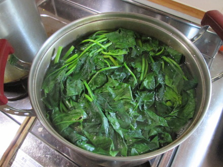 ホウレンソウは熱湯に入れて茹でておひたしにします。写真にはありませんが、ラディッシュの葉も茹でていただきます。