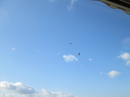 風の中でふわふわと揚がっている凧のようです。時おりお店のすぐ上を横切り、大きな体を真近に見ることができます。大きな翼をつけた茶色の猫のようです。