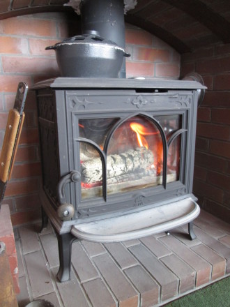 ストーブは焚き出しから薪を二回くべるだけ。その後はペチカとストーブの余熱で十分です。