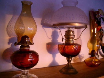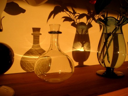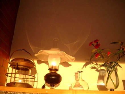 今日のような直視できないような真っ赤の夕日のとき、夕日が白い壁にアートを映し出してくれます。ペチカの上にはたくさんの硝子が飾られています。この硝子を通った夕日の光が、白い壁に自然のアートを描いてくれました。右の写真ではランプの笠から白い炎が上がっているようです。