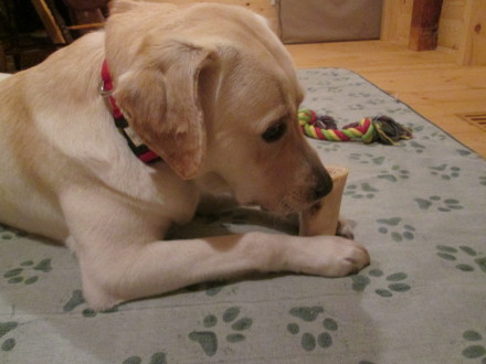 ごとごと転がしながら。夕方部屋に戻ると、うれしくなって牛の骨をかじるふくちゃん。(おまけ)