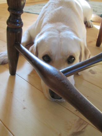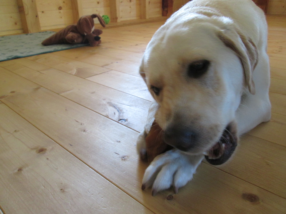 朝の散歩から帰って、木の棒をかじって一遊び。