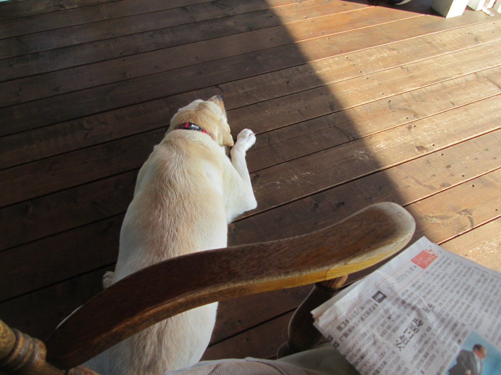 外仕事の合間に、テラスのふくちゃんのお相手。
