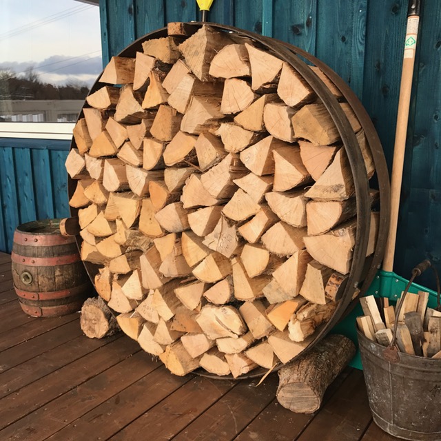 この薪を焚き終わると、テラスには車輪の薪棚に積むだけです。